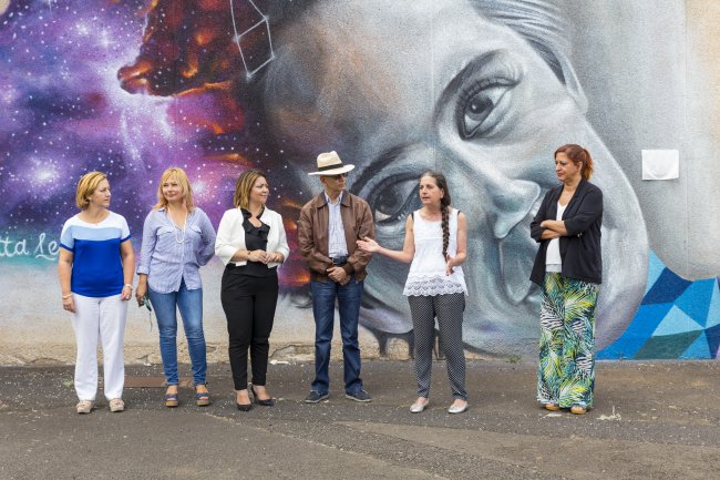 Intervención de María Jesús Arévalo durante la presentación del mural en honor a Henrietta Leavitt en la Facultad de Ciencias de la ULL. De izq. a dcha.: María Candelaria González, Silvana Radescu, Norena Martín, Néstor Torres, María Jesús Arévalo y Carmen del Puerto. Crédito: Elena Mora (IAC)