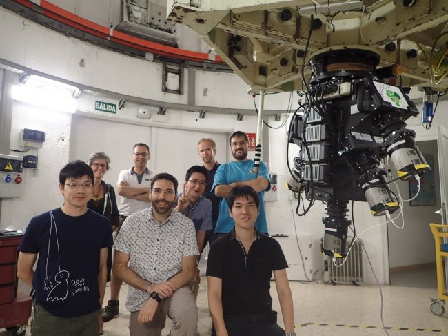 Parte del equipo de la colaboración internacional de instiuciones japonesas y españolas durante la noche en la que se realizó la primera luz del instrumento. Crédito: MuSCAT2 team.