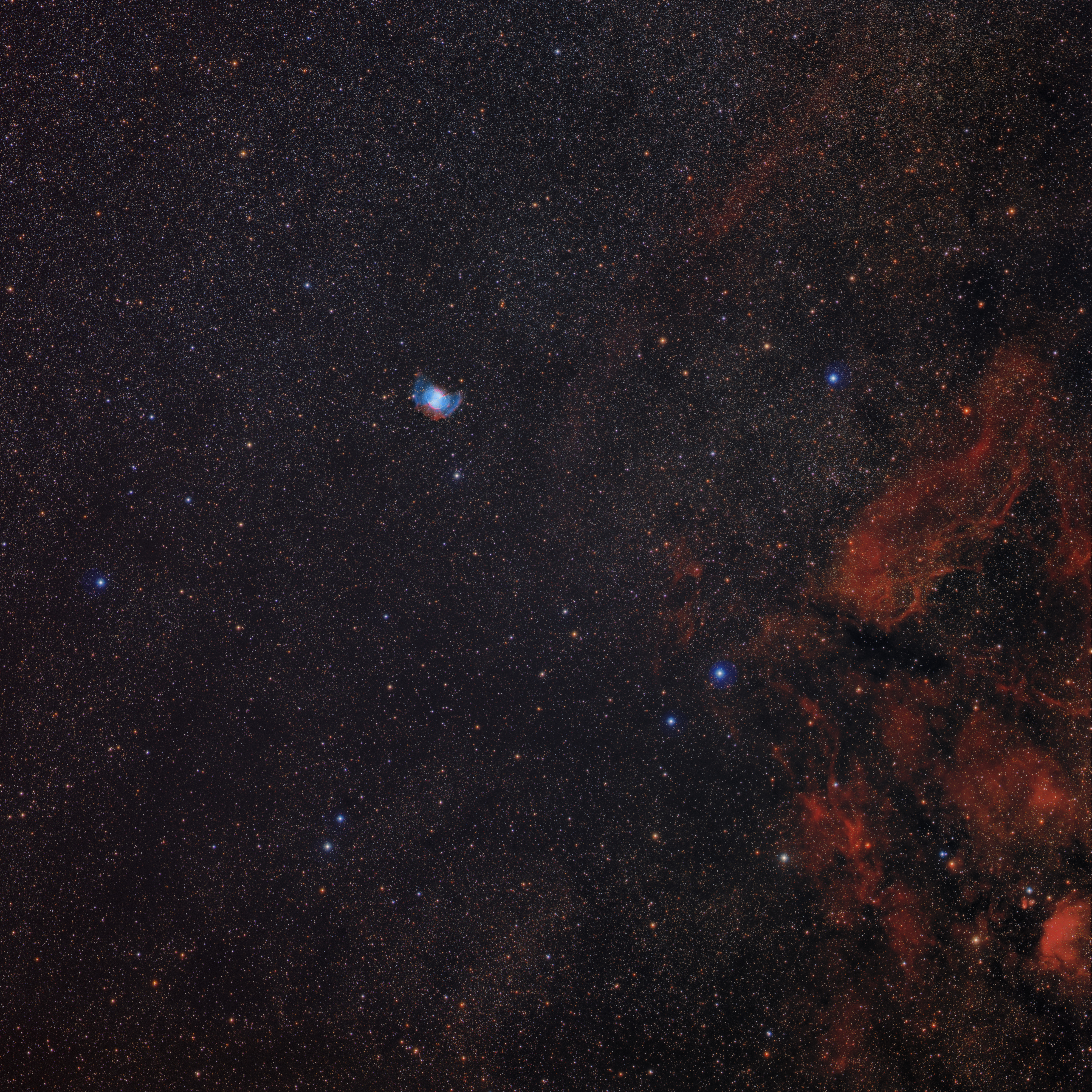 La nebulosa planetaria Dumbbell se encuentra aproximadamente a unos 1.250 a.l. de distancia y mide entre 1 y 1,5 a.l. de diámetro. Es una de las mayores y más brillantes nebulosas planetarias conocidas, siendo la primera en ser catalogada por Messier en 1764 como M27. El particular nombre de estos objetos astronómicos, que nada tienen que ver realmente con los planetas, se debe a que su apariencia es similar a los planetas gigantes gaseosos, vistos a través de los telescopios del siglo XVIII. Se estima que M27 comenzó su fase de transición entre gigante roja y nebulosa planetaria hace unos 10.000 años, y el núcleo de la misma aún está evolucionando a una enana blanca estable. Esta nebulosa planetaria ilustra que la fase final de la vida de una estrella aproximadamente la mitad de masiva que la nuestra no tiene nada de especial. El Sol, en 5.000 millones de años, acabará igualmente su combustible, se expandirá como una gigante roja devorando en el proceso los planetas interiores del Sistema Solar y acabará expulsando sus capas exteriores al espacio, dejando en su centro el núcleo de la estrella, una enana blanca.