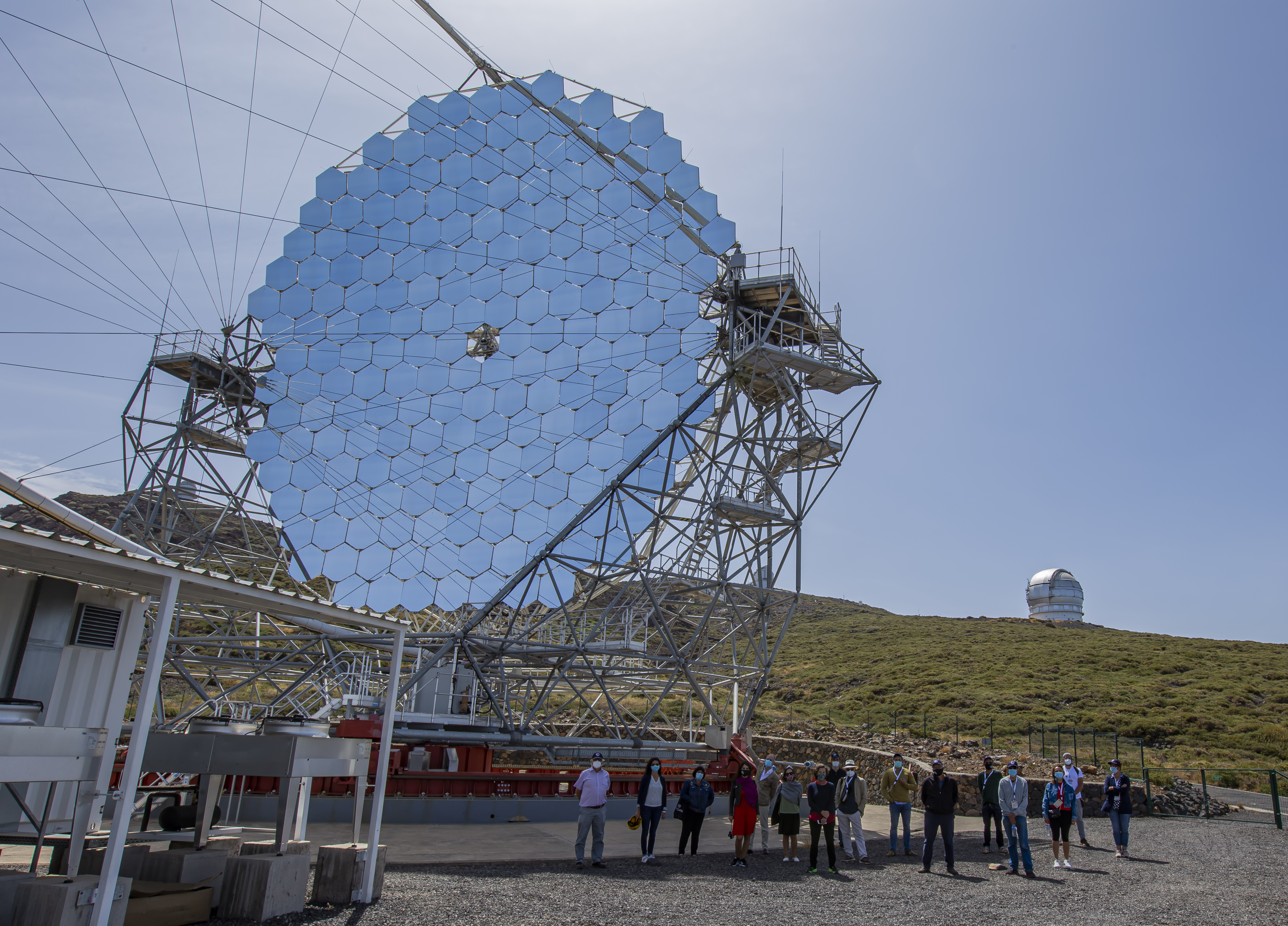 Participantes del III Festival Hispanoamericano de Escritores durante su visita al telescopio LST-1 en el Observatorio del Roque de los Muchachos. Crédito: Juan Antonio González Hernández / IAC.