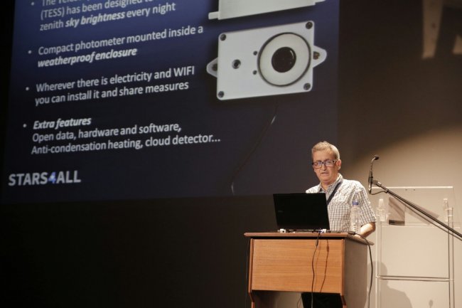 Jaime Zamorano, de la Universidad Complutense de Madrid y miembro de la plataforma europea STARS4ALL, ponene del segundo bloque de la jornada. Crédito: Elena Mora (IAC).