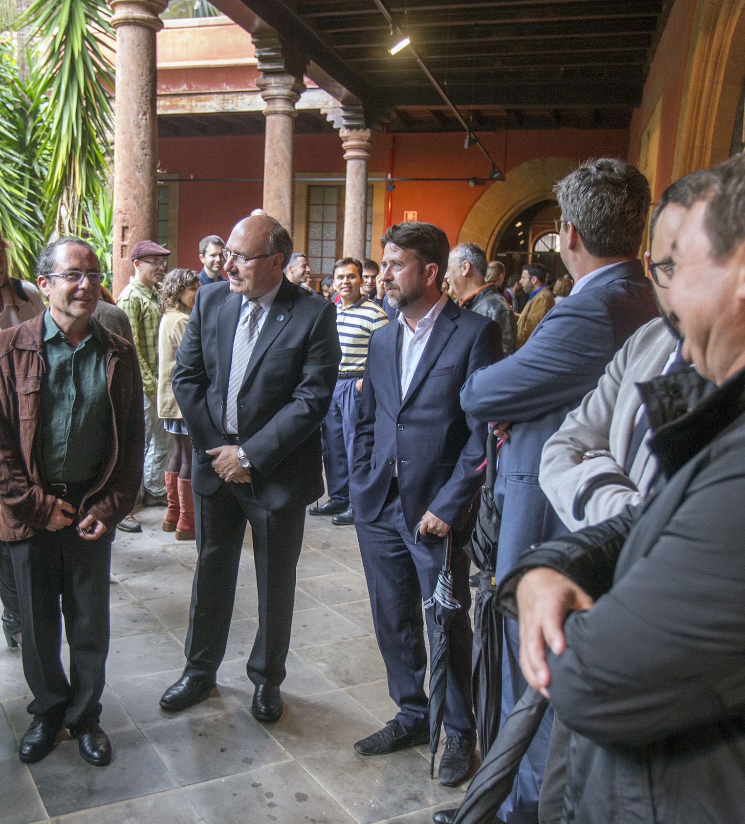 El director del IAC, Rafael Rebolo, el presidente del Cabildo de Tenerife, Carlos Alonso, el director de la ACIISI, Juan Ruiz Alzola, y el Director General de Cultura del Gobierno de Canarias, Xerach Gutiérrez Ortega, con Ignacio García de la Rosa (a la i