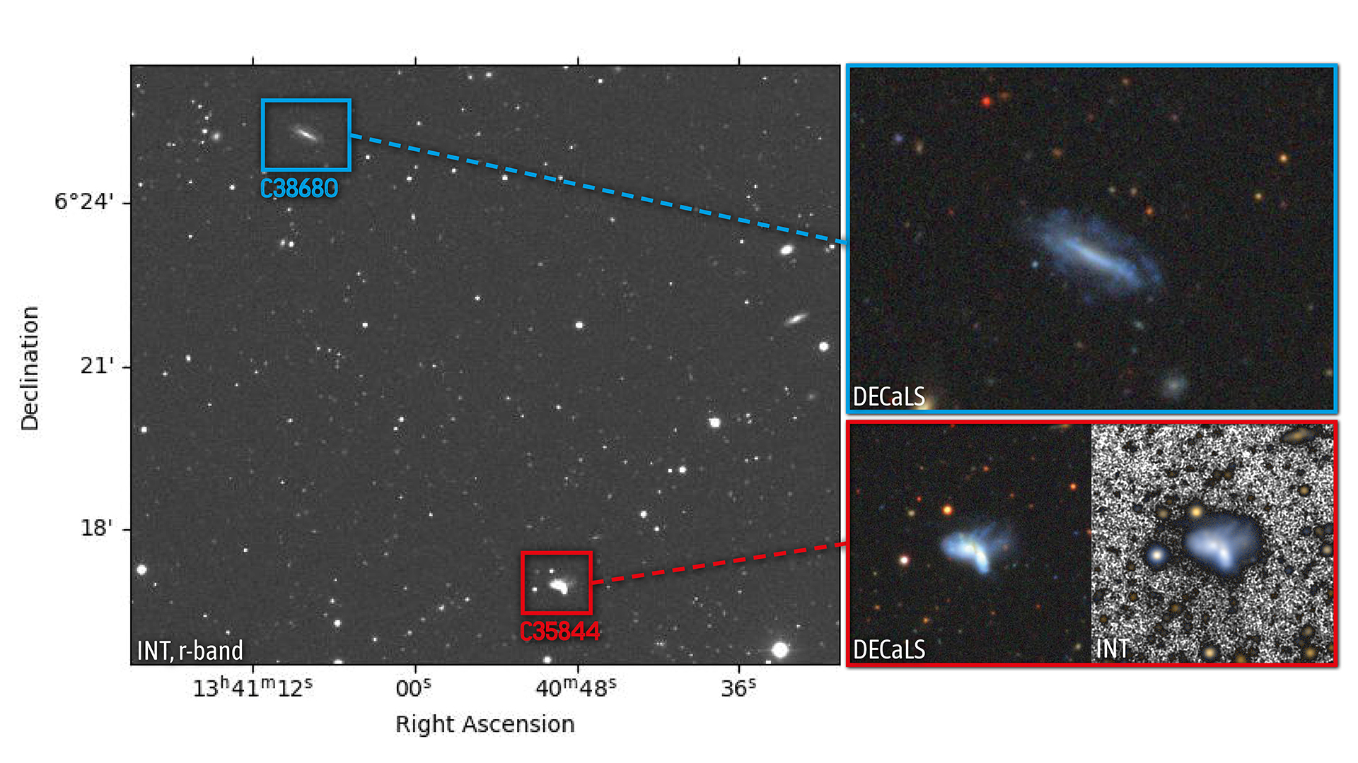 Imagen de un raro par de galaxias enanas en interacción, observado por el proyecto CAVITY. Las dos galaxias protagonistas, CAVITY35843 y CAVITY35844 (recuadro rojo), muestran signos claros de interacción, como núcleos brillantes y colas de marea. También se observa una tercera galaxia, CAVITY38680 (recuadro azul), situada a una gran distancia del par principal y que podría haber desencadenado la fusión. Las imágenes proceden de los telescopios Isaac Newton (INT) y del sondeo DECaLS.