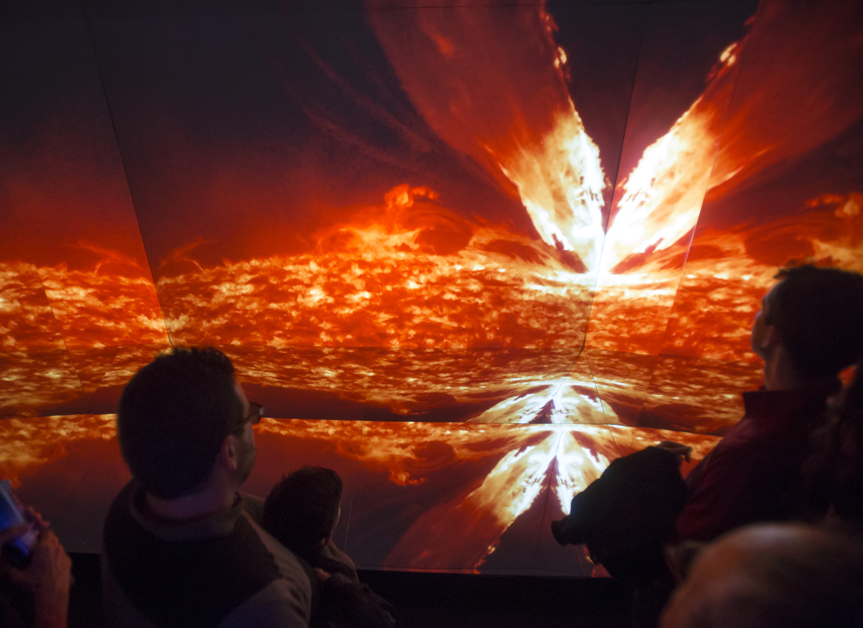 Visitantes de la exposición "Luces del Universo" ante el módulo "Caleidoscopio GTC", donde se proyectan imágenes astronómicas con efecto envolvente. Créditos: Daniel López/IAC.