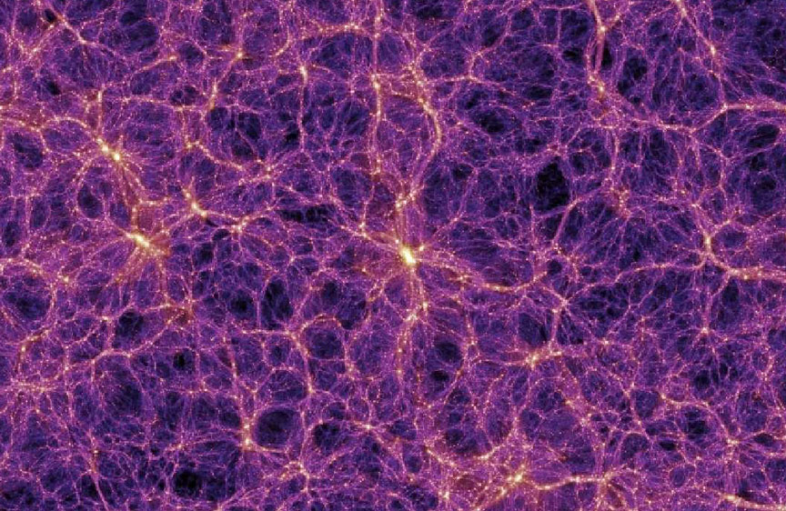 La materia en el universo no está distribuida al azar. Las galaxias, los cuásares y el gas intergaláctico se organizan en filamentos conectados alrededor de enormes vacíos cósmicos, formándose densos cúmulos de galaxias donde se cruzan las paredes, un patrón que se ha comparado con el de las pompas de jabón. Los científicos tienen muchas teorías sobre cómo evolucionó el universo, y las teorías predicen diferentes estructuras a gran escala para el universo. Para investigar cómo ha evolucionado la distribución de la materia en el Universo a lo largo del tiempo y, en particular, cómo se formó la población de galaxias observada, se utilizan simulaciones por superordenador que utilizan más de 10.000 millones de partículas para trazar la evolución de la materia en una región cúbica del Universo de más de 2.000 millones de años-luz de lado. Cada punto de luz en la imagen mostrada representa una galaxia (azul) y los cúmulos de galaxias (naranja) se forman cuando se conectan filamentos de galaxias. Al comparar estos datos simulados con grandes estudios de observación, los astrónomos pueden aclarar los procesos físicos que subyacen a la formación de galaxias y agujeros negros.